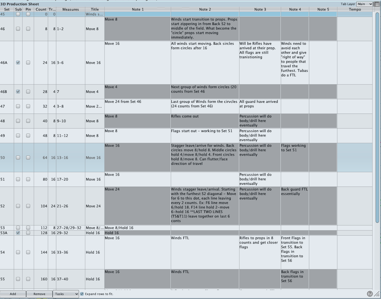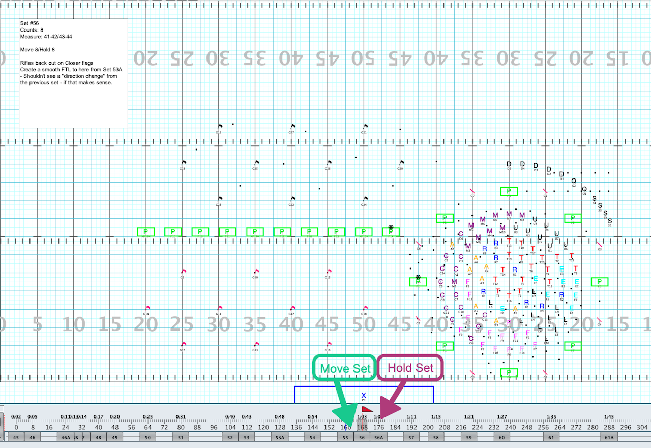 If you have a “move 8, hold 8,” instead of having a 16 count move where you would only have the performers moving for the first 8, instead, add a New Numbered Set Tab after the first 8 counts and a second “Subset Tab” after the second 8 counts to represent the Hold portion, thus breaking the move into “two 8’s.”