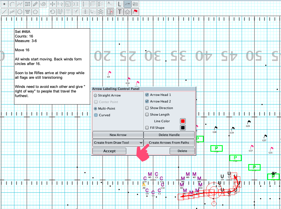 - Click in your drill one click for every step that the students will take. For example, if the drill move is half-time, click it in half-time for that move. The same convention would hold for moves that are in double-time.