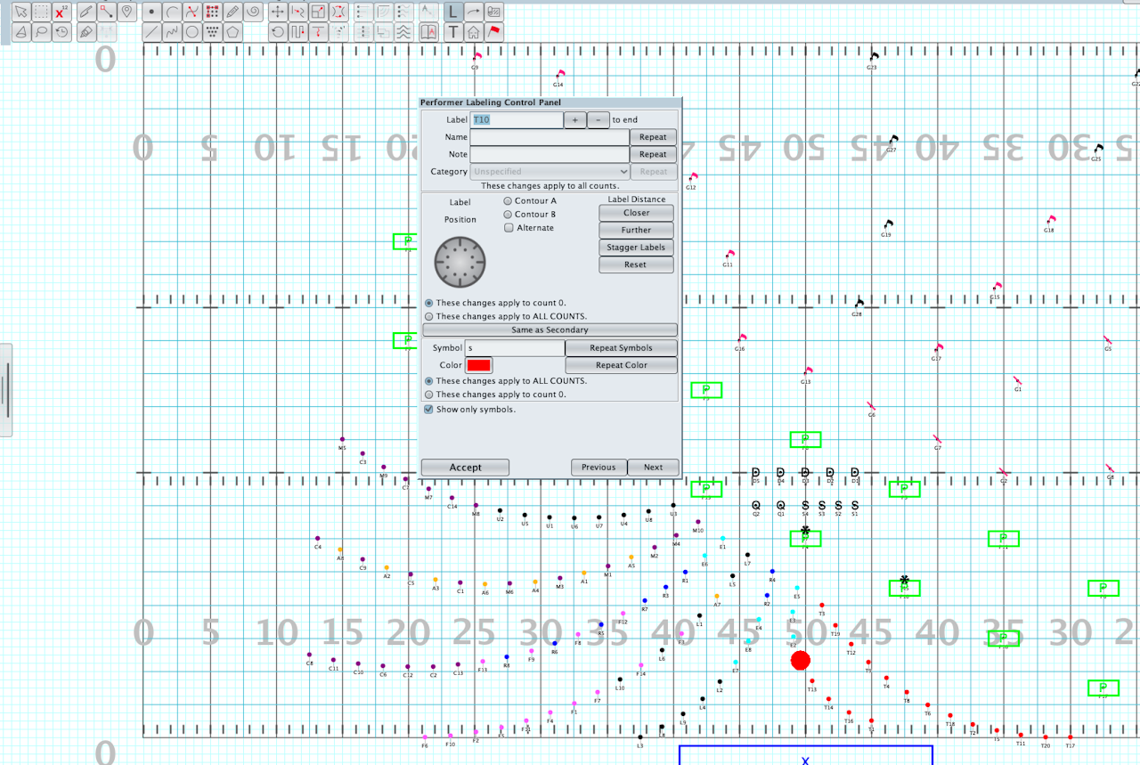 For example, select the trumpets and open the label tool. Type T and 1 in the label box. Tap the plus button to quickly add this same naming convention to all other performers.