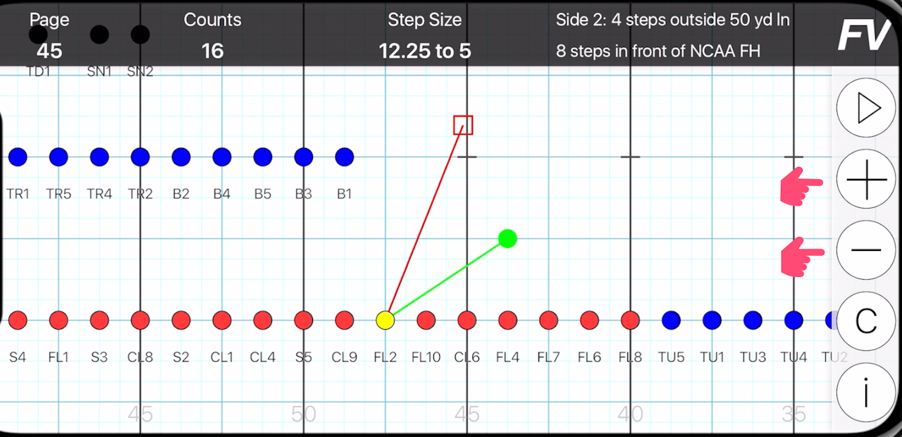 When in page mode, tapping the plus (+) and minus (-) buttons move between the pages of drill. When in counts mode, tapping the plus and minus buttons move through the drill count by count. To toggle between page mode and counts mode, tap the "P/C" icon below the minus button on the control bar.